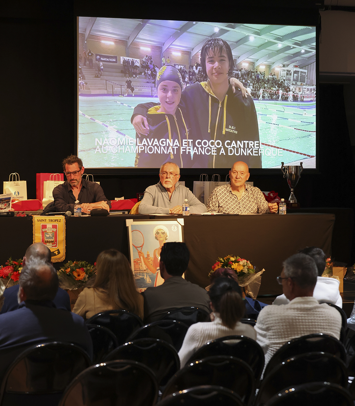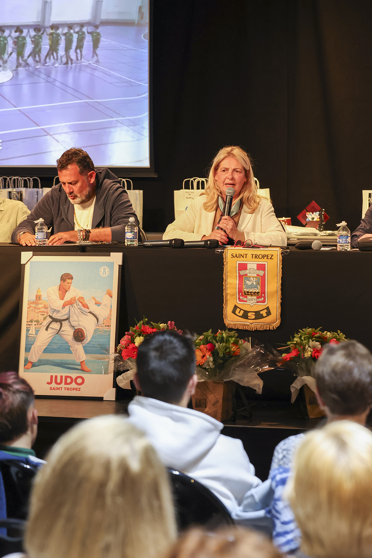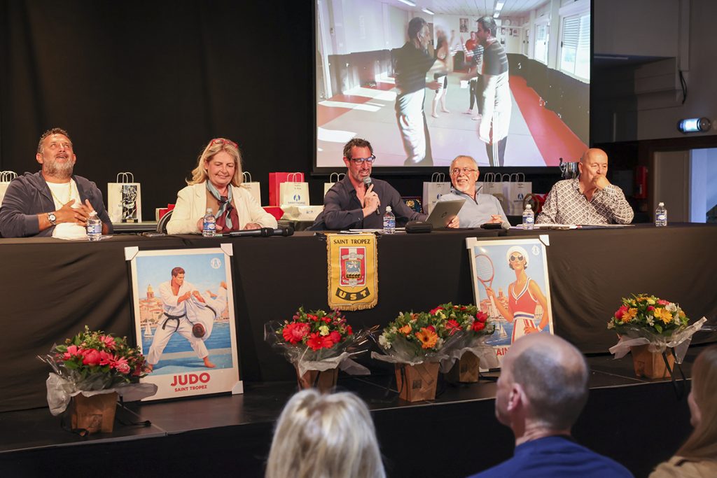 Je vous rappelle que l’UST Omnisport est constitué des sections sportives suivantes (visible sur le film en arrière plan). Aquaform, Badminton, Bowling, Courir à Saint-Tropez, Football, Gym, Judo, Karaté, Karting, Musculation, Handball, La Boule Tropézienne, Natation, Tennis, Tennis de table, Triathlon. Avec dans chaque section des champions que nous découvrirons lors de notre remise des récompenses.