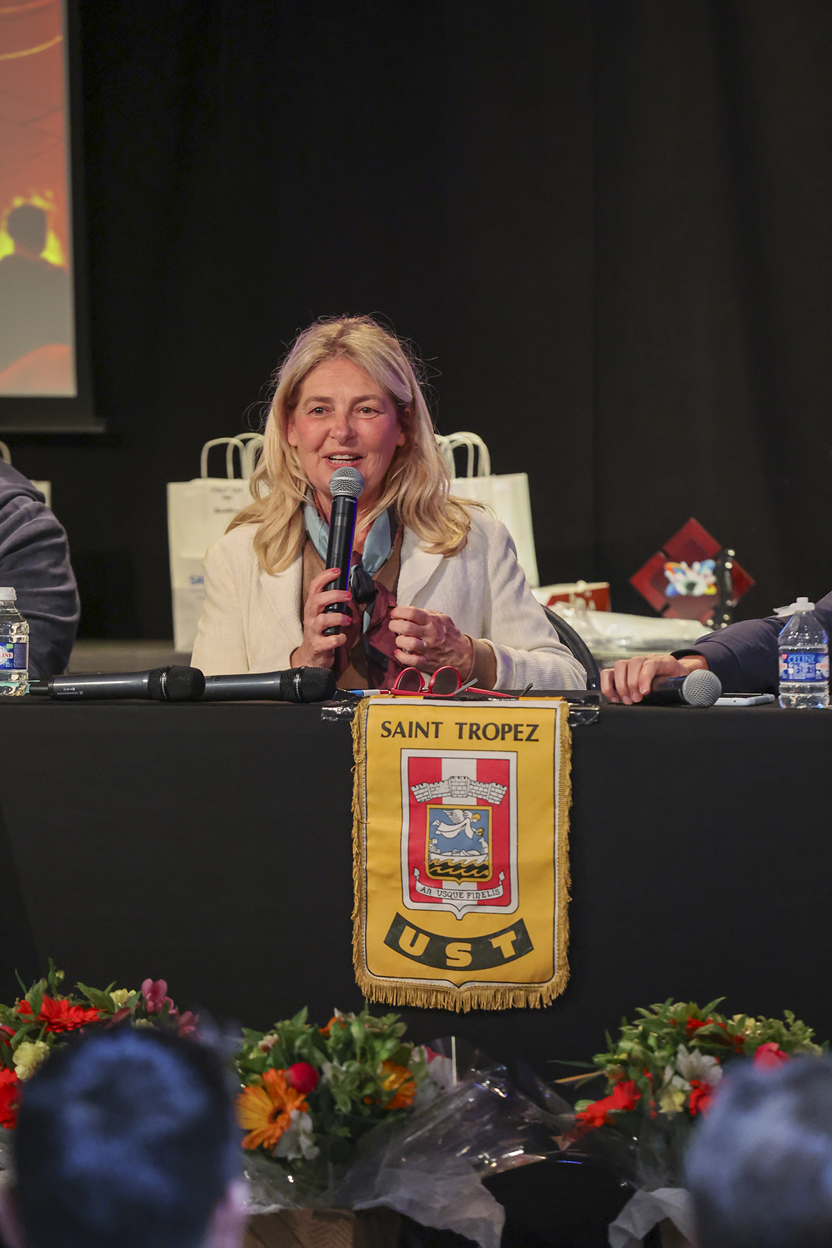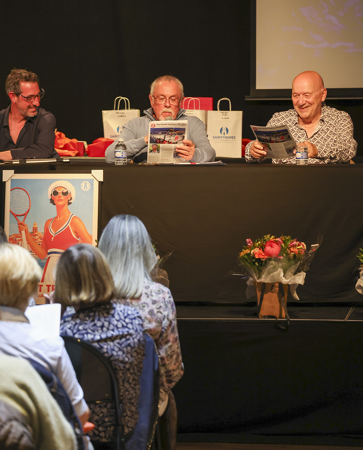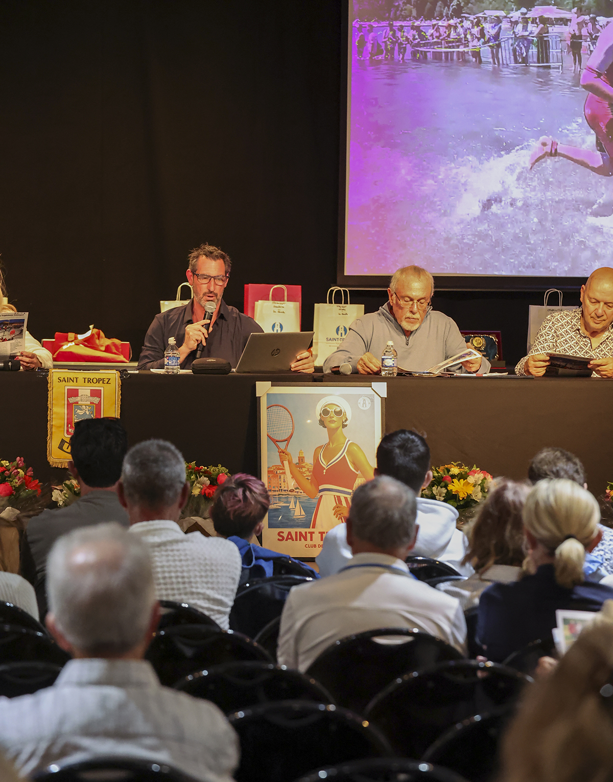 Je vous rappelle que l’UST Omnisport est constitué des sections sportives suivantes (visible sur le film en arrière plan). Aquaform, Badminton, Bowling, Courir à Saint-Tropez, Football, Gym, Judo, Karaté, Karting, Musculation, Handball, La Boule Tropézienne, Natation, Tennis, Tennis de table, Triathlon. Avec dans chaque section des champions que nous découvrirons lors de notre remise des récompenses.