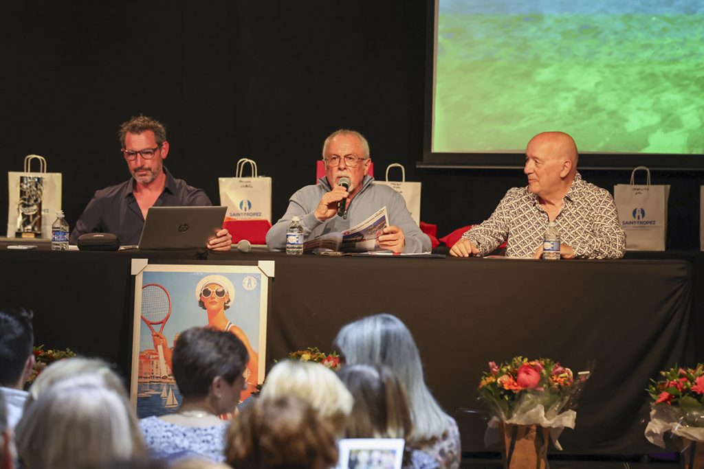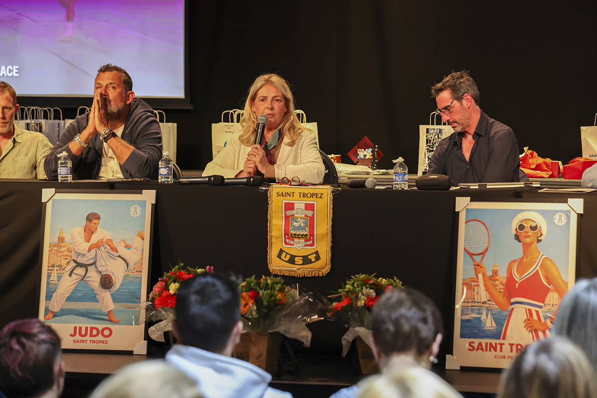 Frédéric Della Valle, président de l’UST Omnisport avec Jean-Max Vitrant, secrétaire et Jean-Albert Guides, trésorier, présente le rapport moral à Sylvie Siri, maire de Saint-Tropez et Christophe Coutal, adjoints aux sports de la ville de Saint-Tropez et aux licenciés.