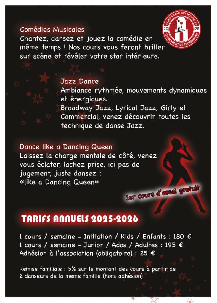 Cours de danse pour enfants et adultes. Comédies musicales, chantez, dansez, jouez la comédie en même temps… Jazz Dance, ambiance rythmée, mouvements dynamiques et énergiques. Broadway Jazz, Lyrical Jazz, Girly et Commercial. Dance like a Dancing Queen, lâchez prise en dansant sans jugement…